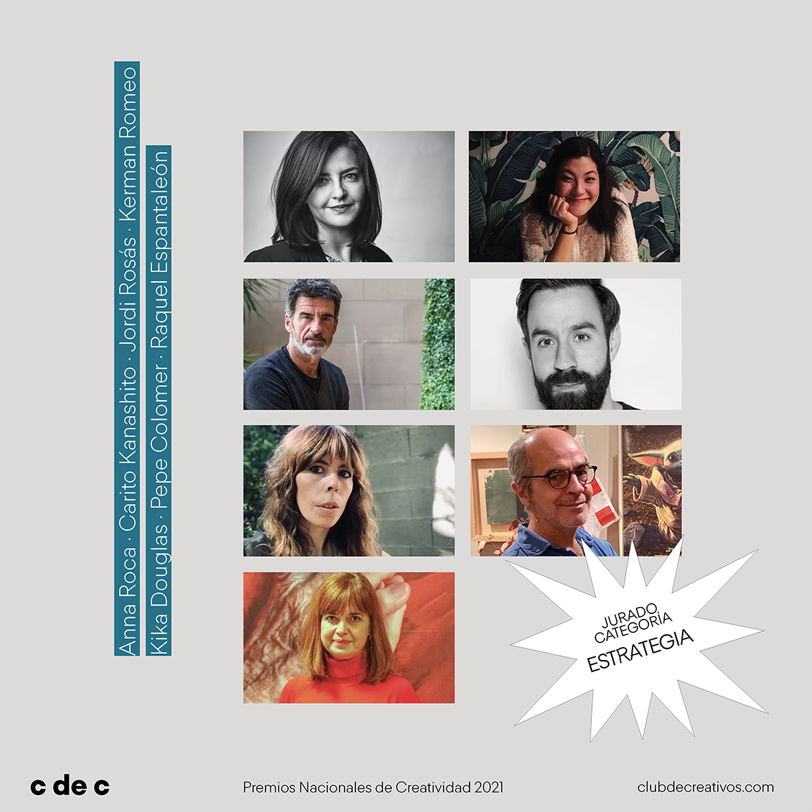 Los profesionales que compondrán el jurado de ESTRATEGIA son: Anna Roca, directora de estrategia y transformación en BBDO España; Carito Kanashiro, campaign director Iberia & Latam en TCC Global; Jordi Rosás, responsable de estrategia en &Rosás; Kerman Romeo, head of fame & media effectiveness en KFC; Kika Douglas, directora creativa ejecutiva en DentsuACHTUNG; Pepe Colomer, director creativo independiente, y Raquel Espantaleón, head of strategic planning en Sra. Rushmore.