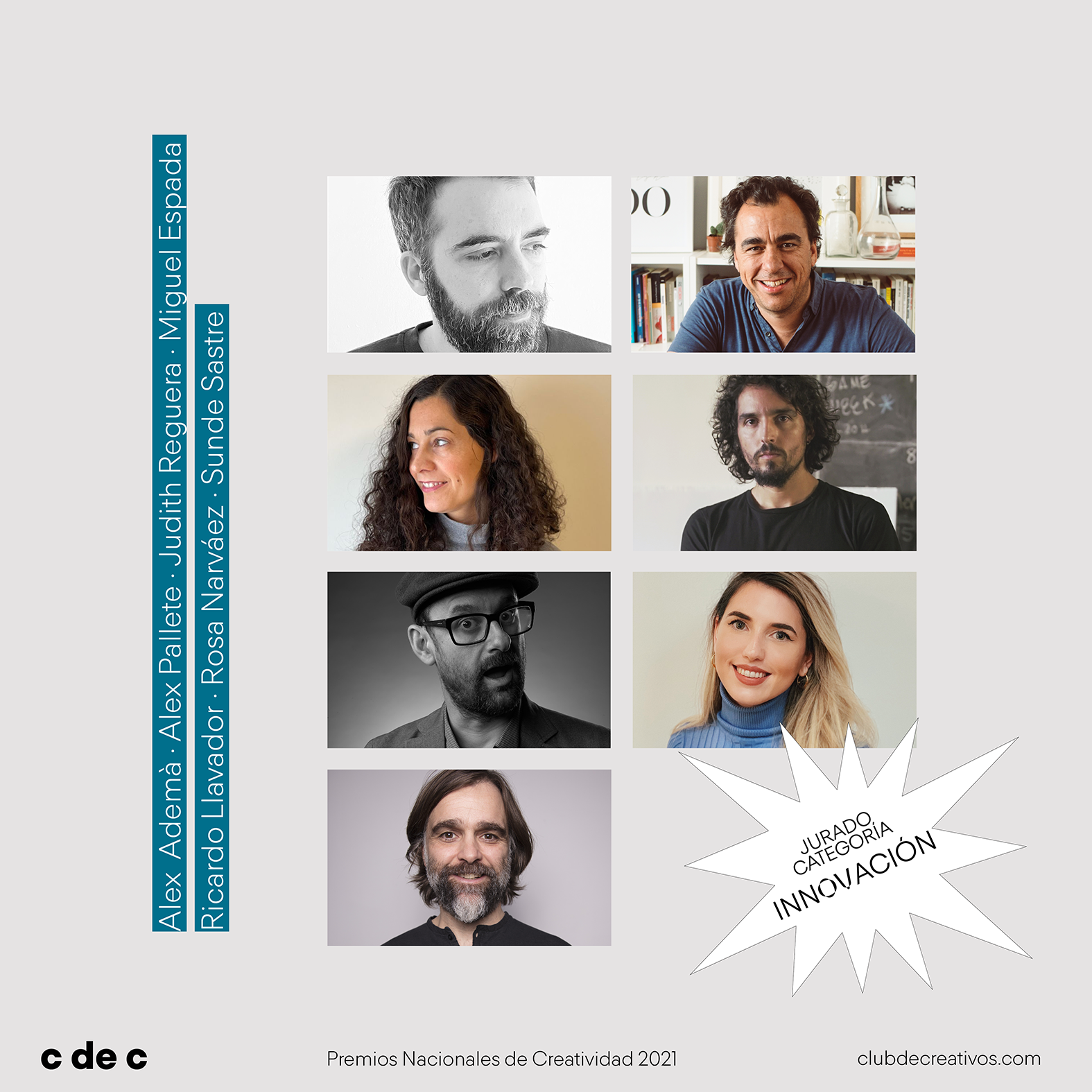 Los profesionales que compondrán el jurado de INNOVACIÓN son: Alex Ademà, chief creative officer en Visyon; Alex Pallete, founder & chief strategy officer en Picnic; Judith Reguera, co-fundadora en La Habitación de las Niñas; Miguel Espada, co-fundador en Espada & Santacruz; Ricardo Llavador, director creativo y socio en Wine&Went; Rosa Narváez, omnichannel and cognitive cx lead en Iberia, y Sunde Sastre, socio fundador y consultor creativo en Collage.